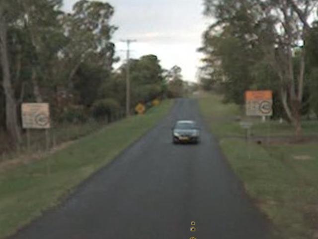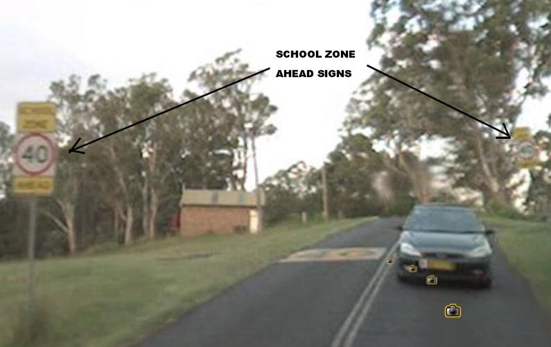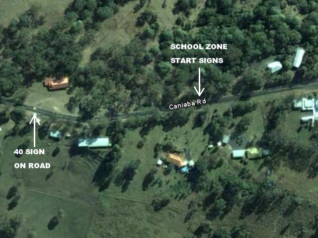 At the town of Caniaba, west of Lismore, there is an even more confusing situation. The painted 40 sign on the road is 227m before the "School Zone" signs themselves. It is co-located with two "School Zone Ahead" signs.