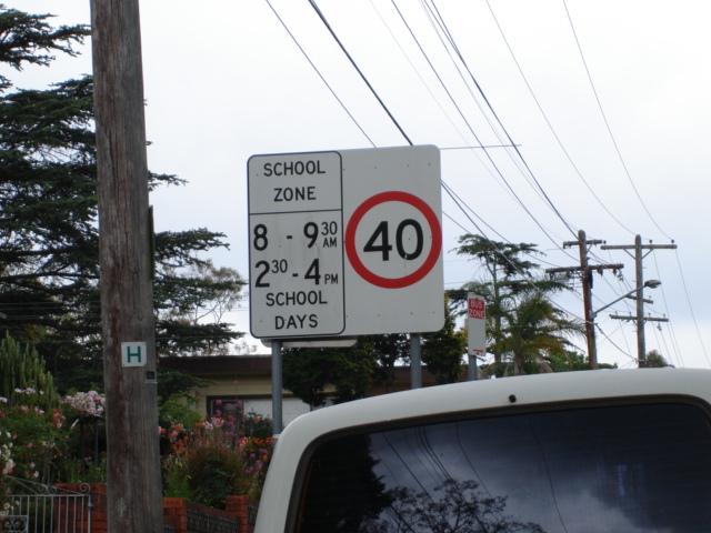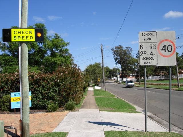 The left-hand 40km/h sign southbound on Herring Rd Marsfield at Kent Rd Public School was knocked over by a truck in late 2008. The sign has still not been replaced.